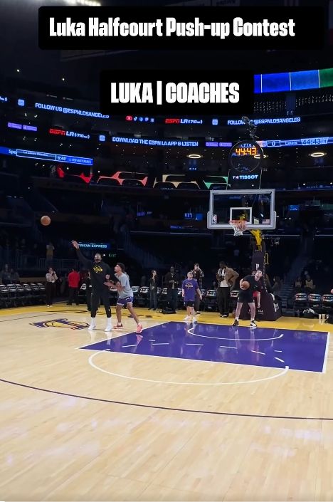 湖人官方社交媒体晒出视频,东契奇在赛前和助教比拼中场三分投篮。